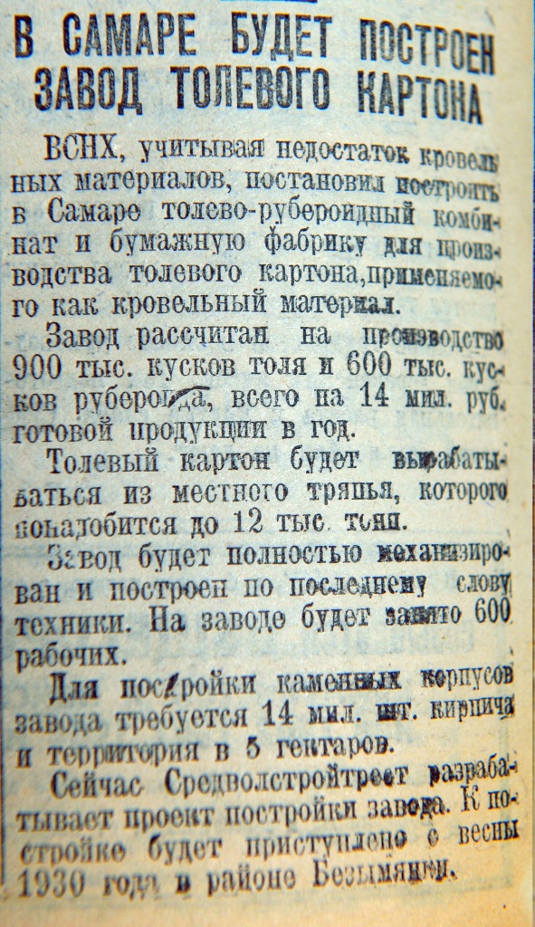 ВСНХ, учитывая недостаток кровельных материалов, постановил построить в Самаре толе-рубероидный комбинат и бумажную фабрику для производства толевого картона, применяемого как кровельный материал.